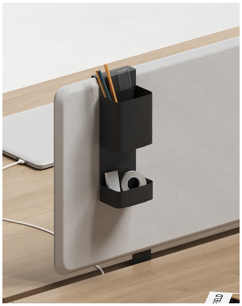 New Partition Panel Accessories Paper Holder For Screen Panel ACOUSTICWORKS A compact shelf made from powder-coated metal, designed to clip onto desk or screen panels. Ideal for holding small office essentials such as notepads, phones, and stationery while keeping the desktop clear. View