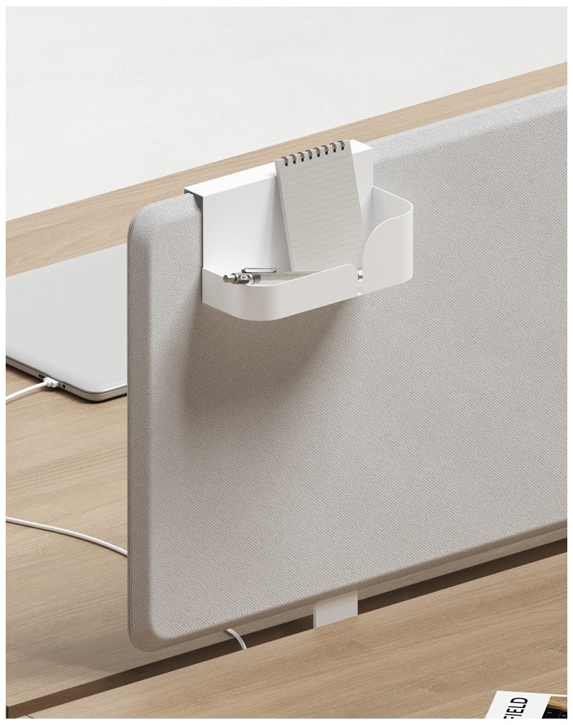 New Partition Panel Accessories Paper Holder For Screen Panel ACOUSTICWORKS A compact shelf made from powder-coated metal, designed to clip onto desk or screen panels. Ideal for holding small office essentials such as notepads, phones, and stationery while keeping the desktop clear. View