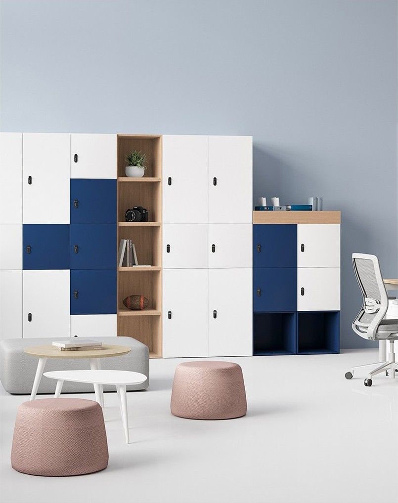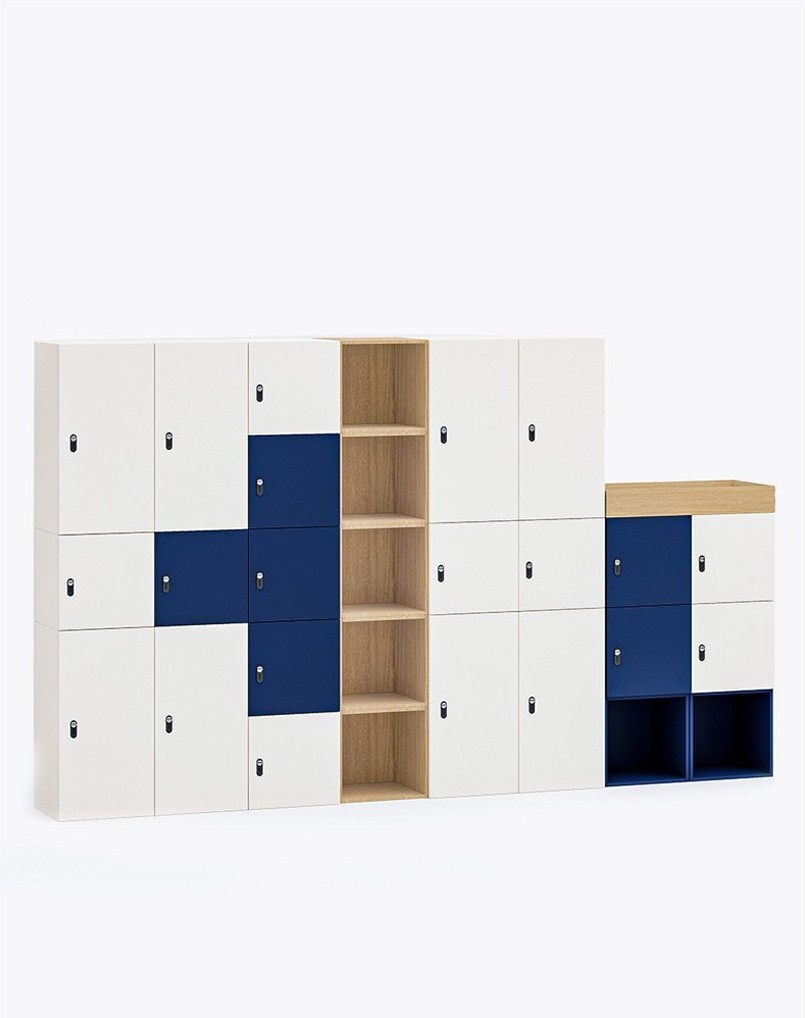 Versatile modular storage system combines functionality and style featuring durable 16mm laminate board with steel doors. Combination of open shelves, modular unit with combination locks, and vertical shelves. It also includes magnetic EVA letter stickers and it is also available in different color options.